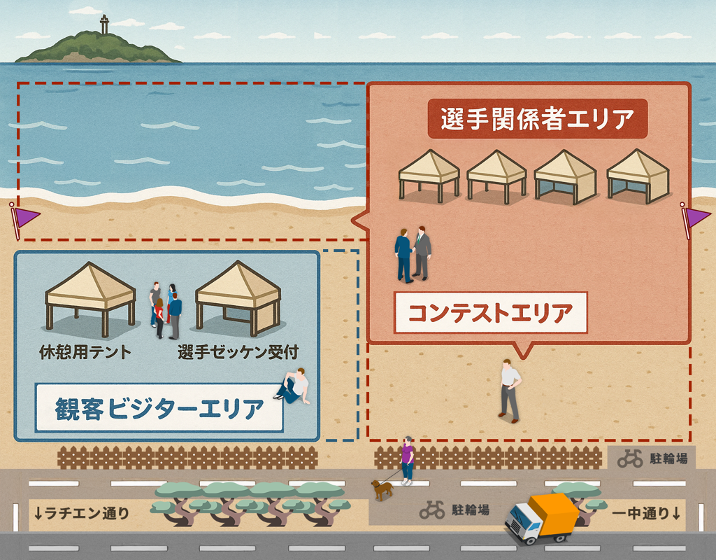 選手・大会関係者のみ立ち入りが可能です。ボディーボード競技では、選手が演技を行うための決められた海の範囲を「競技エリア」と呼びます。 波に乗れる範囲が明確に指定されており、そのエリア内でのライディングのみが採点対象となります。