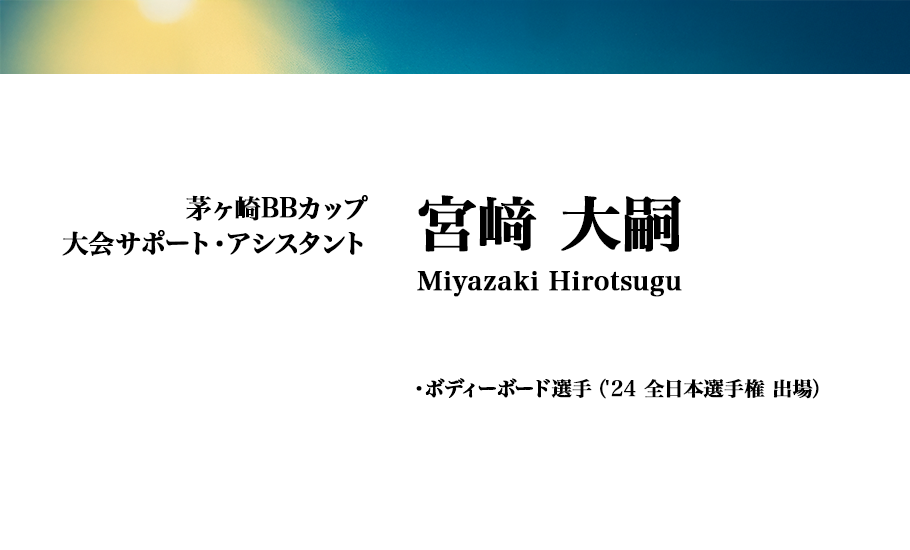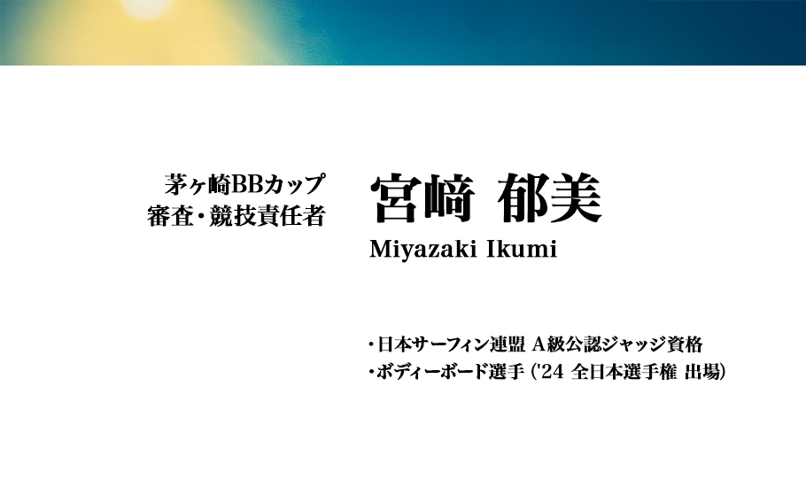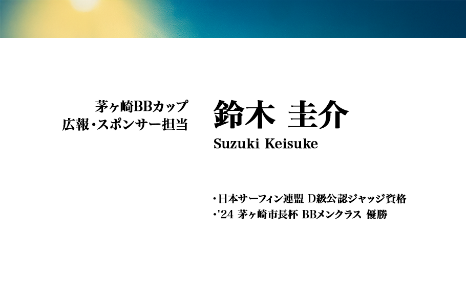 ボディーボード歴10年。なかなか一コケから脱出できない。。でも大会は好きです。 色んなポイントにお邪魔させていただきますが、鵠沼は仲間のいる大好きな場所です。 とにかくボディーボードの楽しさを知ってもらいたいと思いながら、自分が1番楽しまないと!と思ってます!! 第一回のこの大会を継続していただきたい願いと共に自分の精一杯で頑張ります!!宜しくお願いします。